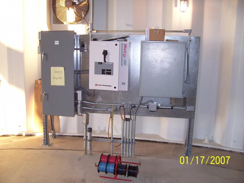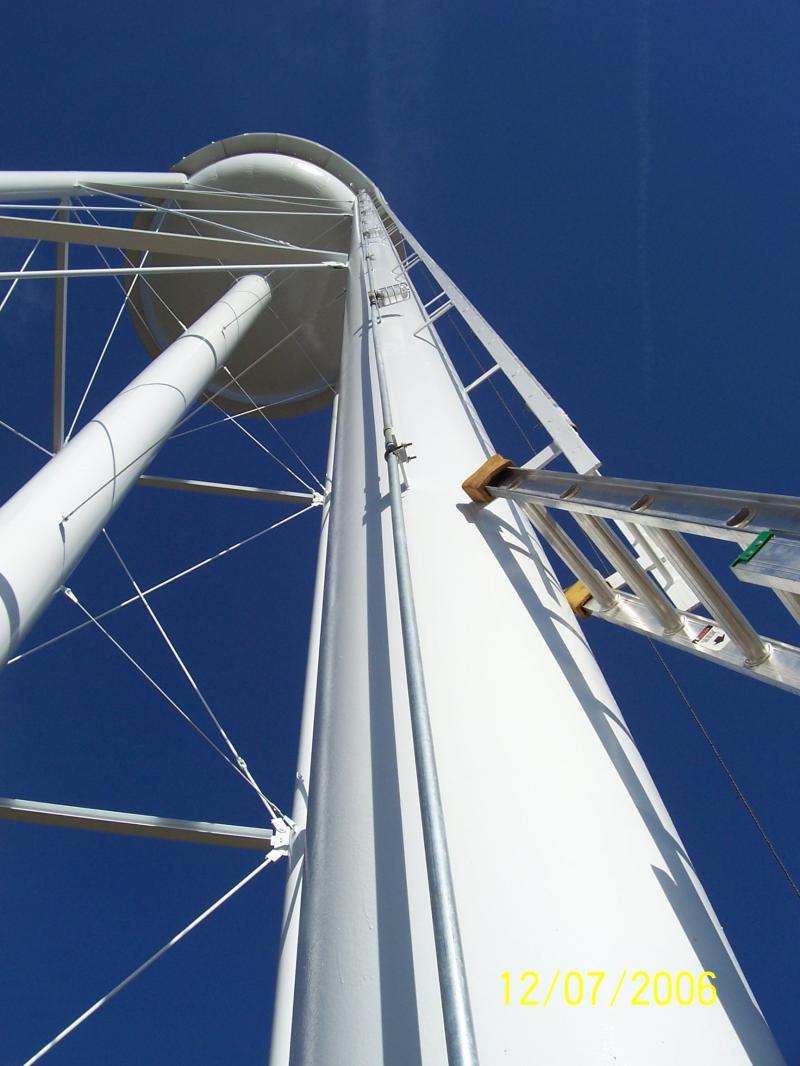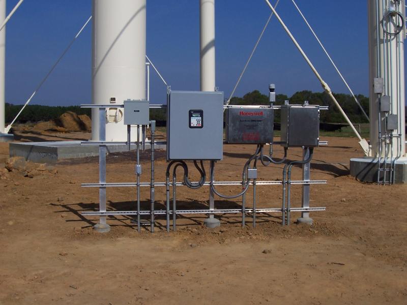 Here you see a large aluminum rack we built for a leg tank in Cordele, GA. Mounted on the rack (left to right) are a load center, SCADA (telemetry) panel, FAA L-865 obstruction lighting control panel and a security system panel. We used infrared technology to secure the tank site. Note the three steel conduits on the ladder column. This is a leg tank built by Phoenix Fabricators & Erectors, Inc. at Cordele, GA. The tank is 244' to top capacity line. See the tank on the "Projects" page.